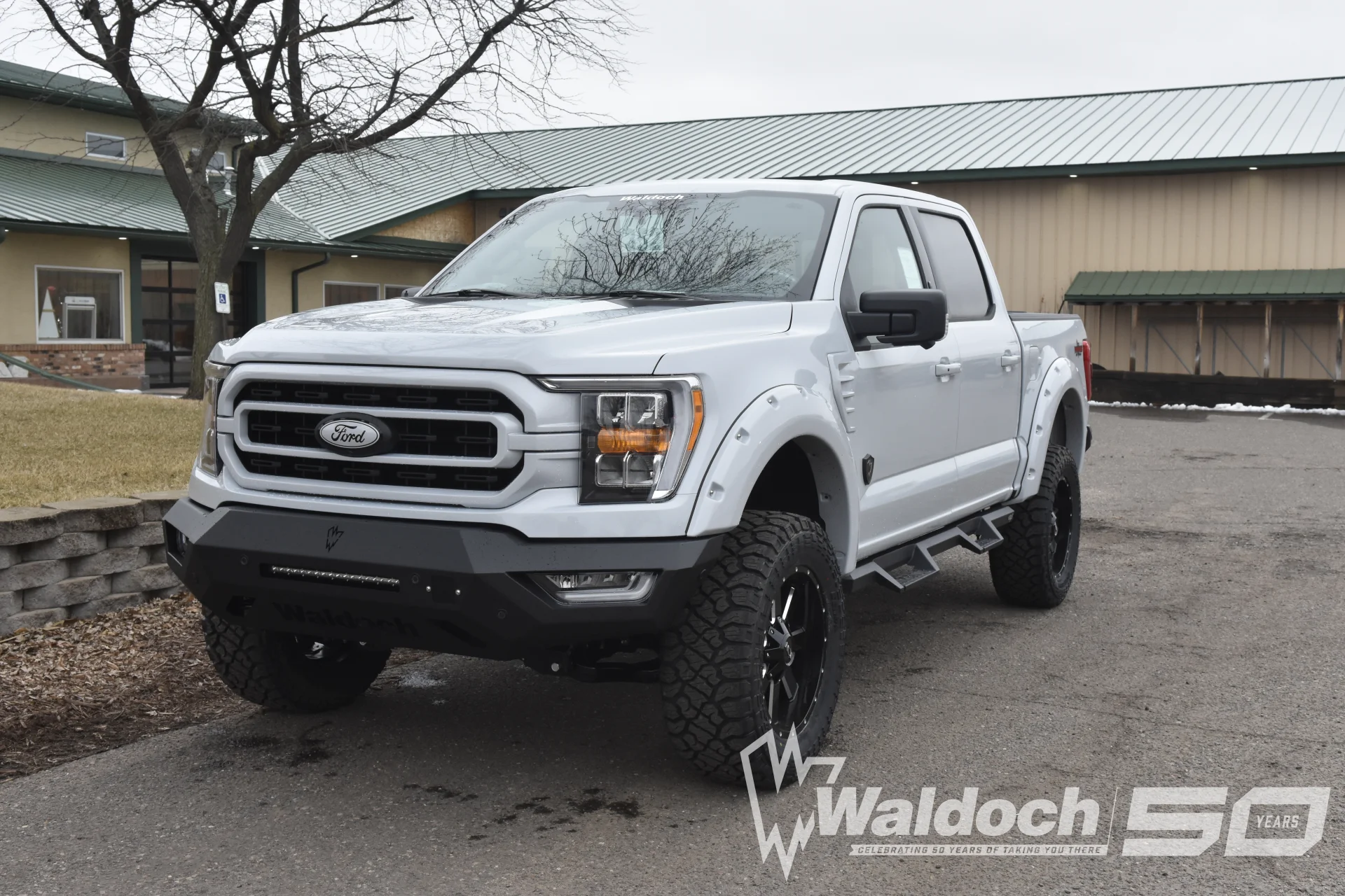 This is a striking custom Ford F-150 Rampage Edition by Waldoch, finished in a clean and modern moon white that really highlights its aggressive upgrades.