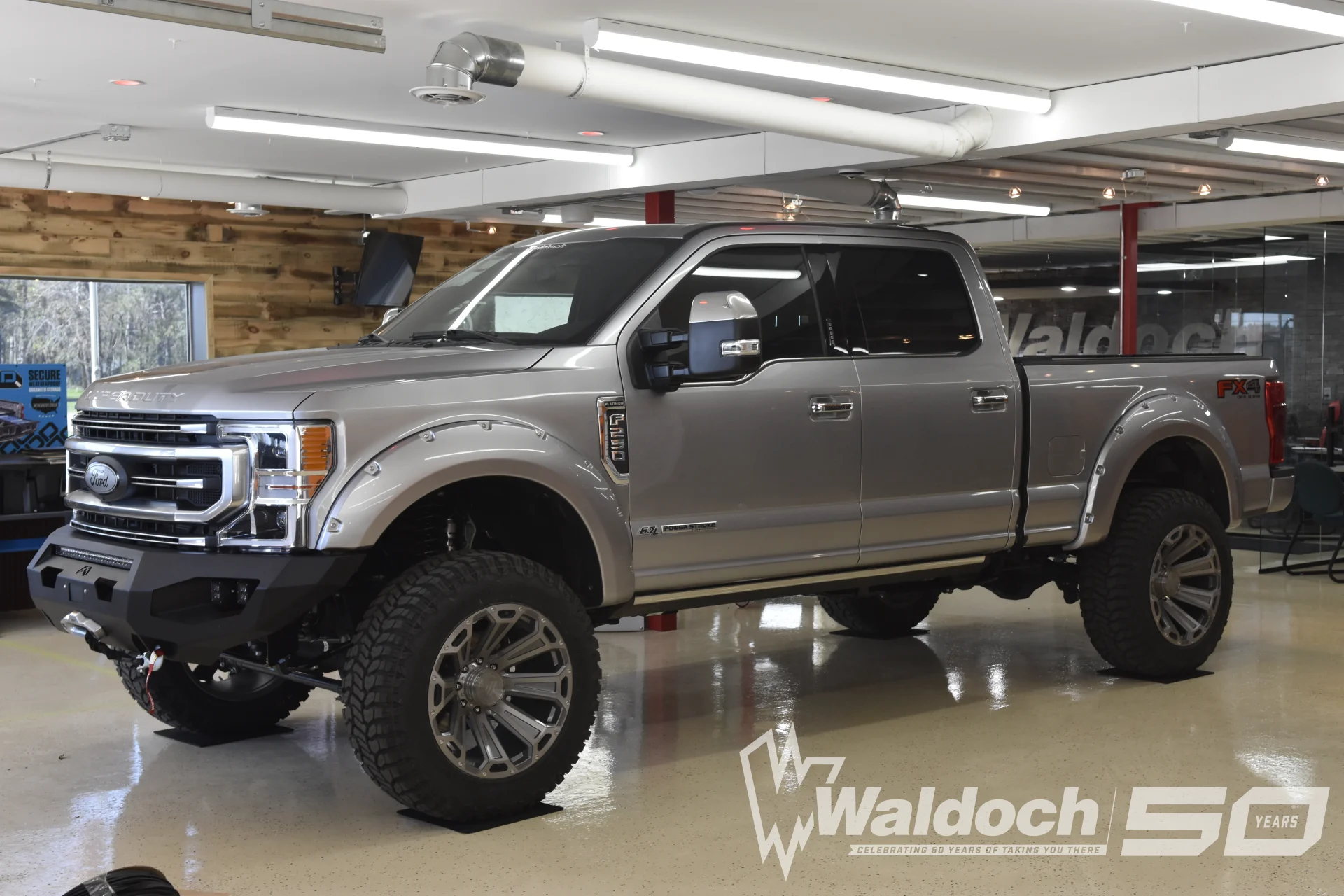 Waldoch Signature Wheels: The truck rolls on large-diameter, turbine-style alloy wheels with a deep concave design. The machined faces and dark pockets echo the silver and black theme of the body.