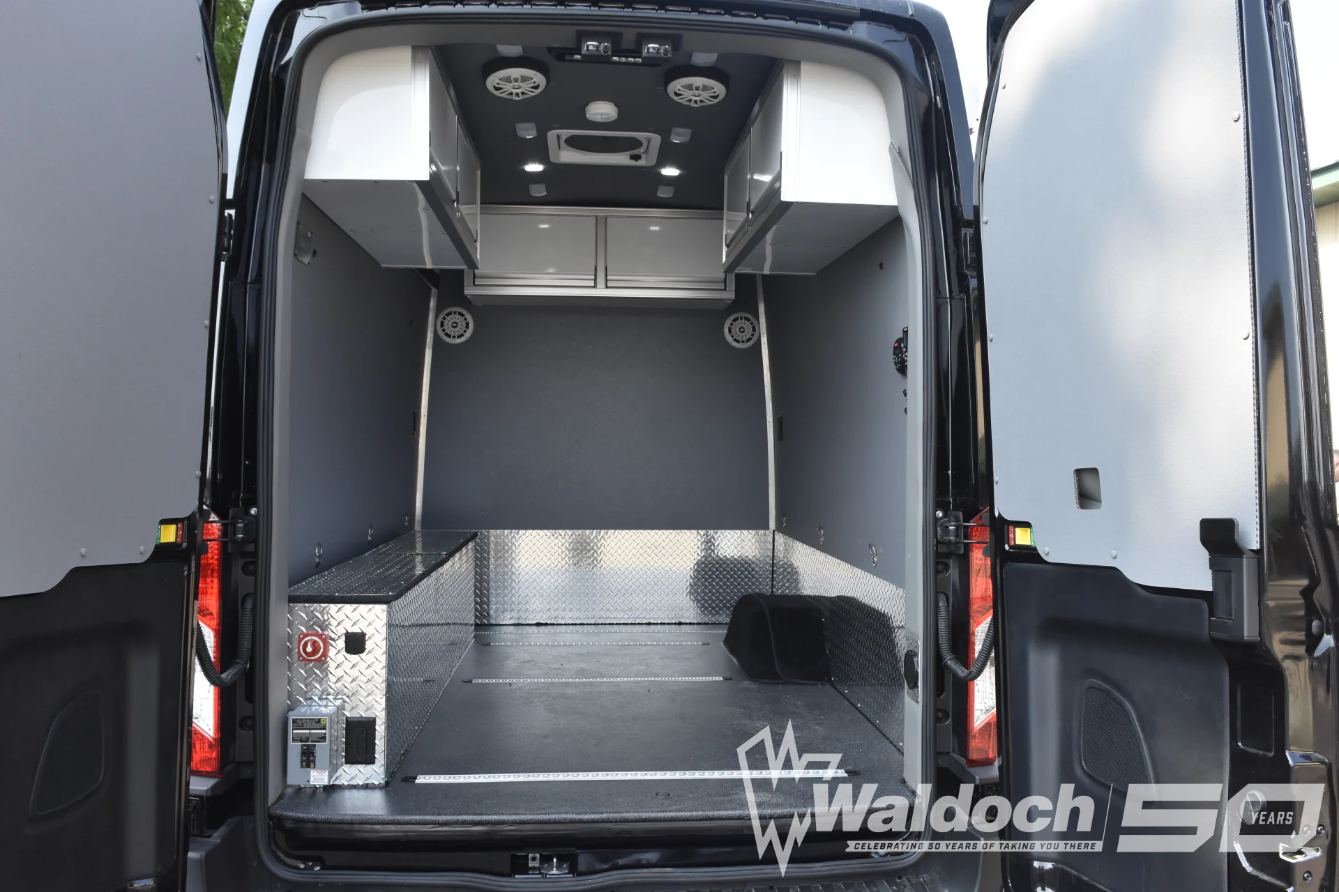 This image shows the interior cargo area of a Ford Transit 148 EL (Extended Length) High Roof, professionally upfitted by Waldoch into a "Moto Van" specifically designed for transporting motorcycles and motocross gear.