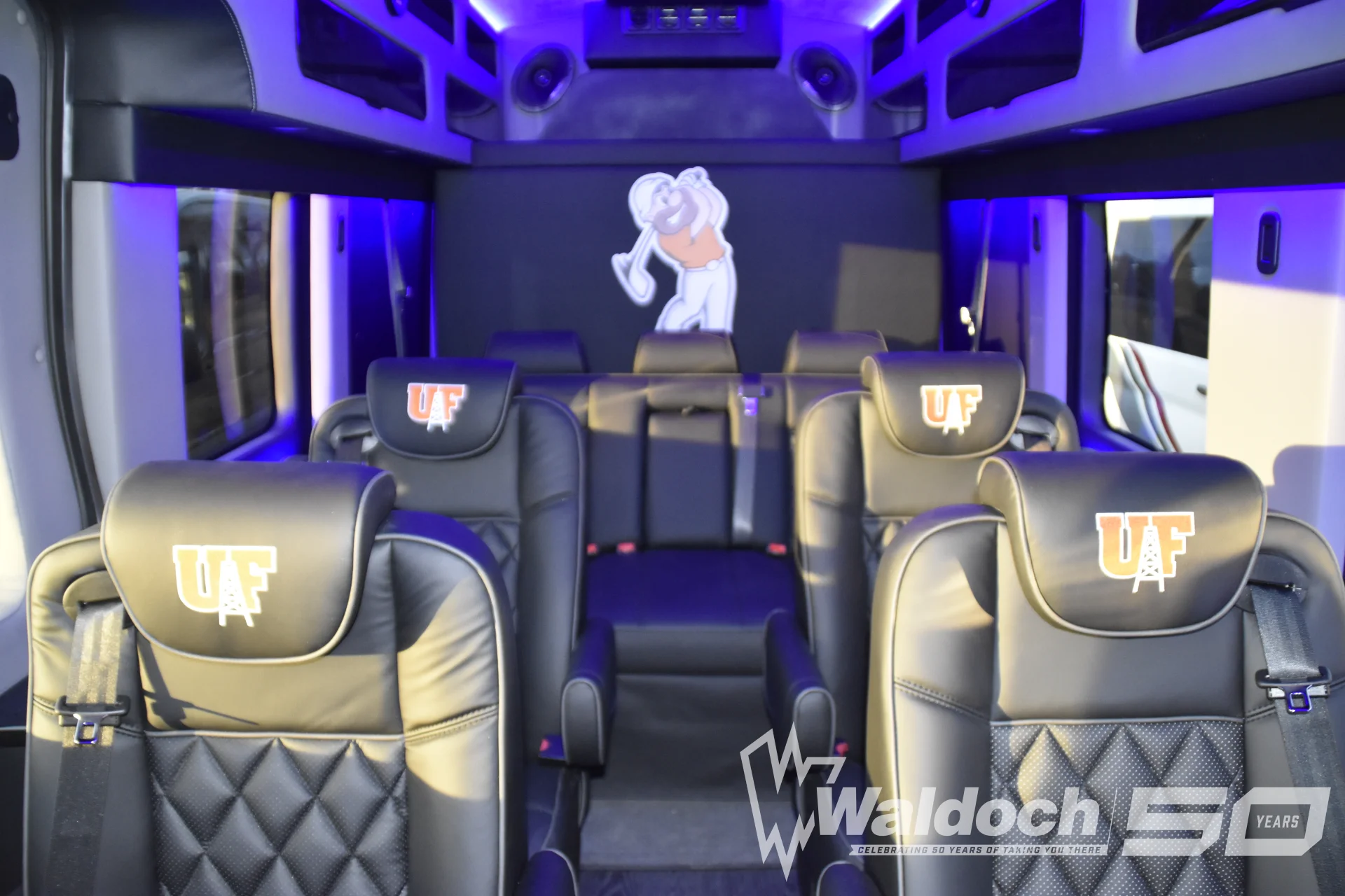 University Branding: This build features custom-embroidered "UF" logos on the headrests and a large, illuminated team mascot integrated into the rear bulkhead, fostering team pride and a professional recruitment image.