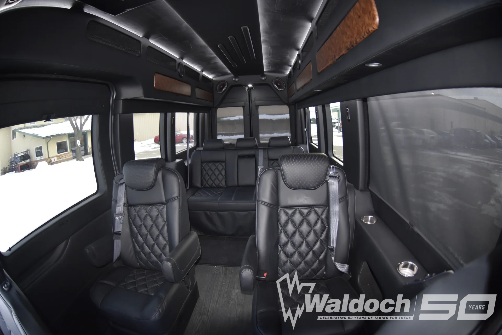 11-Passenger Configuration: The cabin is outfitted with high-back, ergonomic captain’s chairs and a rear bench. The mid-row seats are often Maybach-style bucket seats that feature 3-point integrated seatbelts and quick-release hardware for layout flexibility.