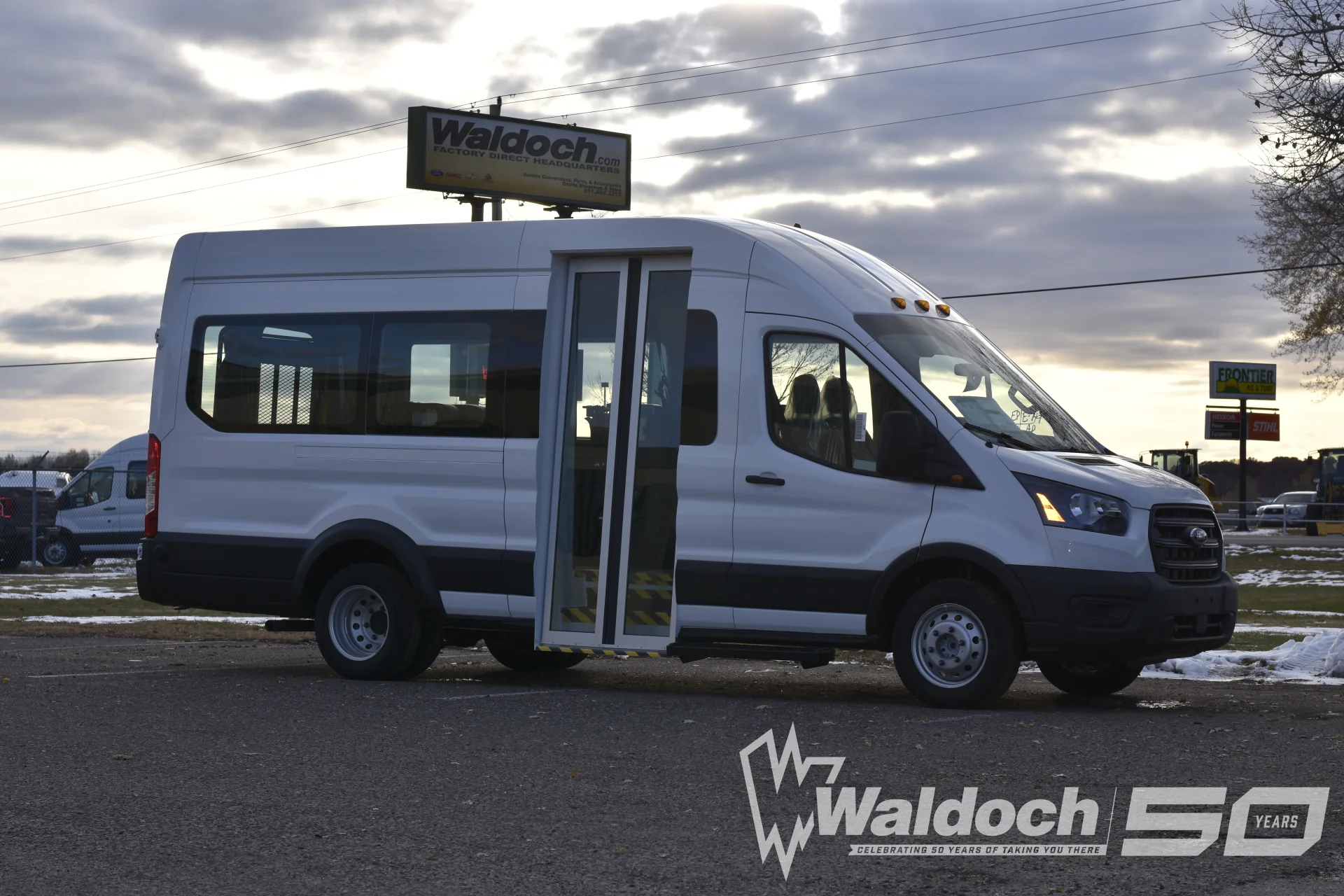 This 2021 Ford Transit 148 High Roof Mobility Commercial Package by Waldoch is a specialized transport solution designed for high-frequency shuttle services and ADA-compliant mobility. The standout feature of this specific build is the electric "Bus Door" conversion, which replaces the standard sliding door to offer a wider, more efficient entry point for passengers.