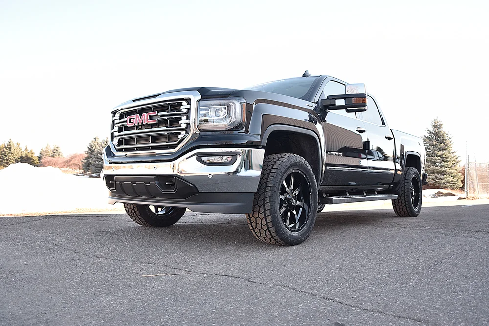 Browse 9 photos of this 2019 GMC Sierra 1500 truck by Waldoch, featuring Waldoch's Level package with a professional leveling kit, upgraded wheels and tires, and a balanced aggressive stance.