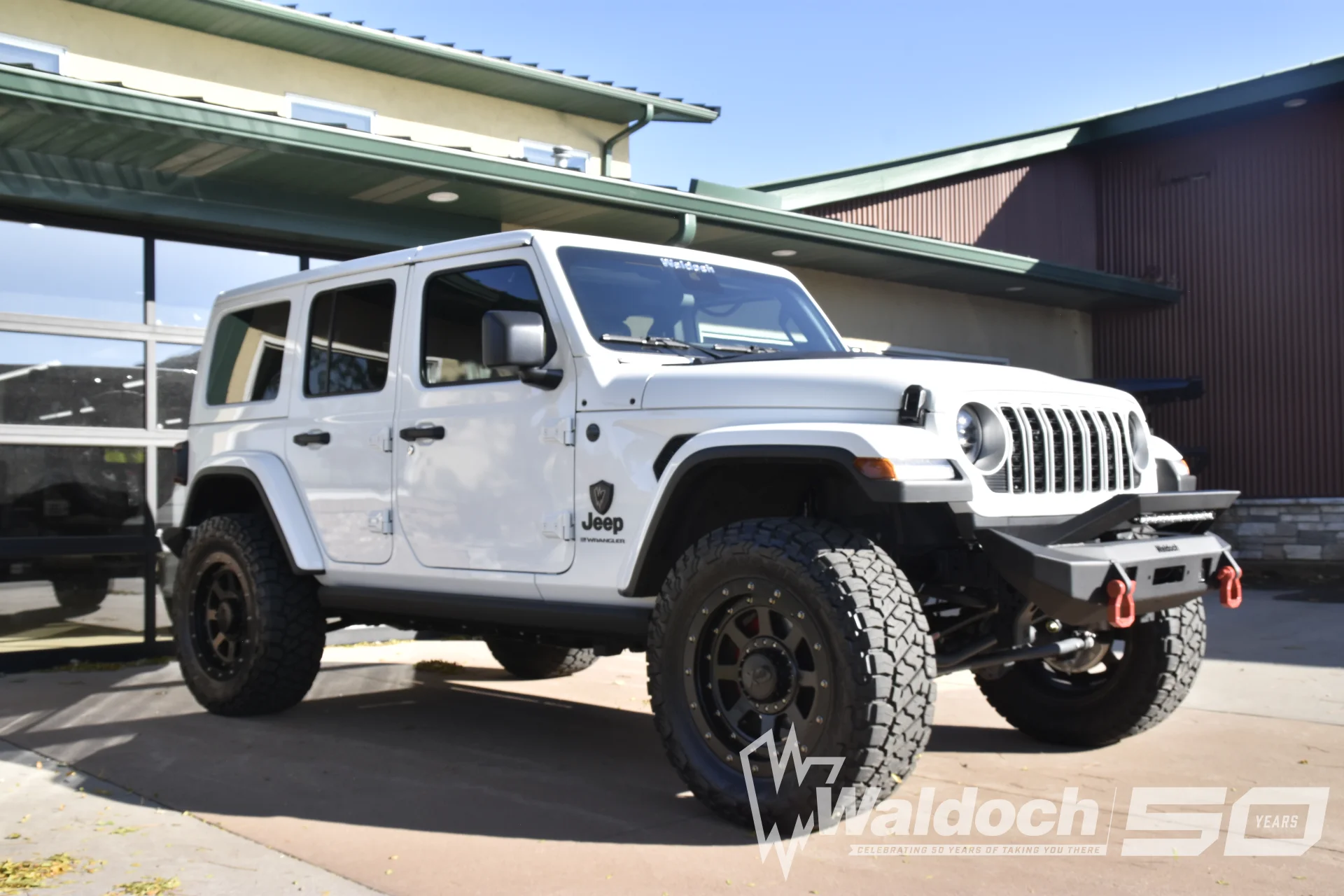 This Jeep Wrangler with the Waldoch MAX package is built for serious off-road performance with a bold, purpose-driven look. Finished in clean white with black accents, it features an aggressive lift, oversized all-terrain tires, and heavy-duty black wheels with beadlock-style detailing. The front end is upgraded with a rugged steel bumper and integrated tow hooks, enhancing both capability and protection. Subtle Waldoch badging and refined touches keep it looking premium while still trail-ready. Overall, the MAX package delivers a fully capable, adventure-focused Wrangler with a strong, lifted stance and no-compromise durability.
