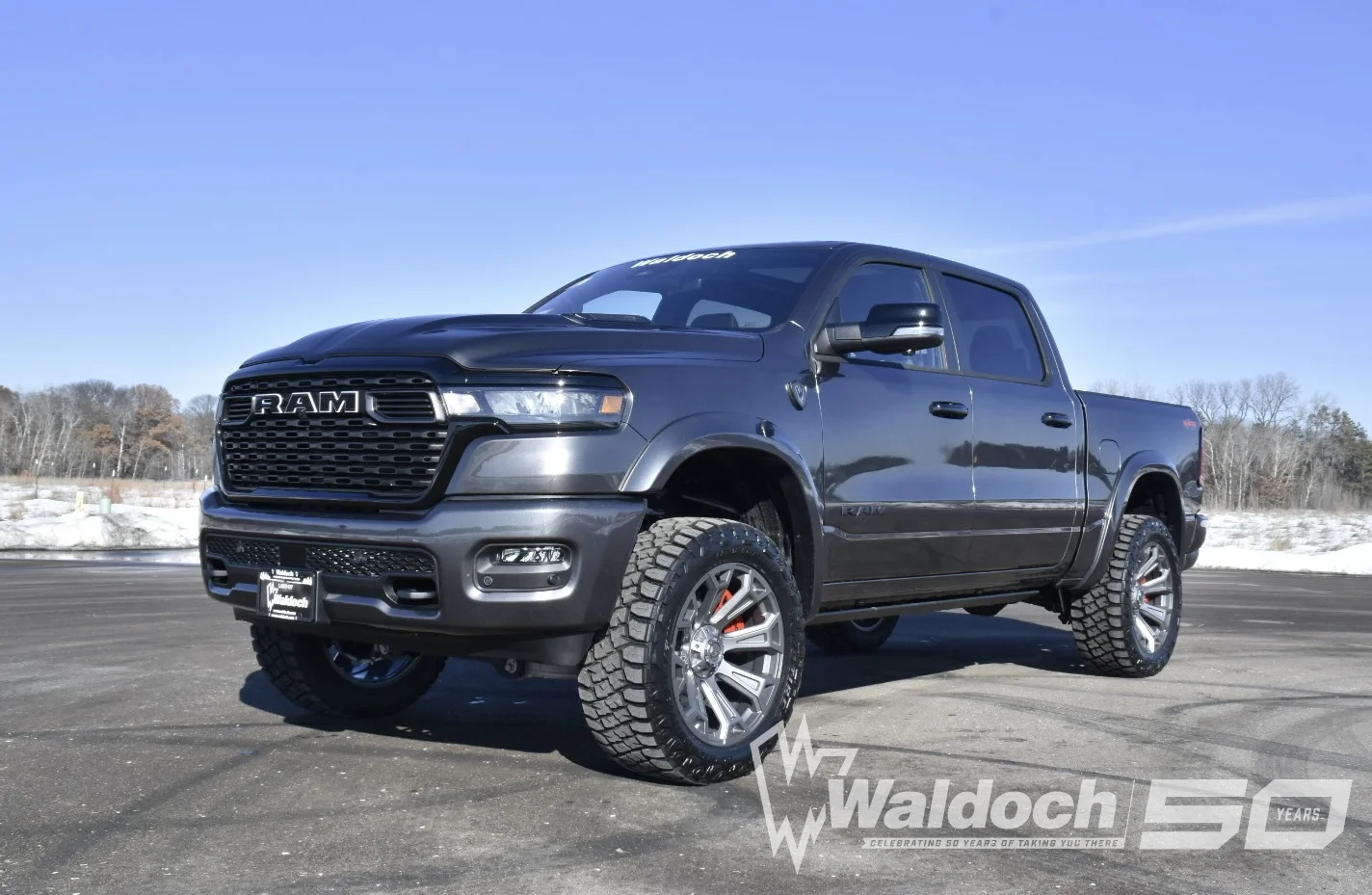 This Waldoch Ram Rampage is a bold, fully reimagined full-size truck that blends aggressive off-road presence with refined interior craftsmanship. Finished in a sleek metallic gray, it sits on a lifted stance with large multi-spoke wheels, rugged all-terrain tires, and performance red brake calipers that give it a commanding, high-performance look. The blacked-out grille and subtle Waldoch badging add to its premium, stealthy aesthetic. Inside, the cabin is transformed with custom-trimmed leather seating featuring detailed stitching and patterned inserts, delivering a sporty yet upscale feel. The interior carries a clean, OEM-plus execution with upgraded materials and finishes throughout, making the Rampage not just a head-turner on the outside, but a comfortable, high-end driving environment on the inside.